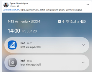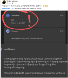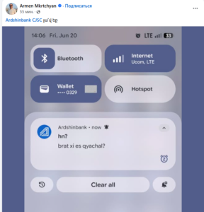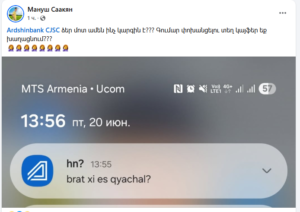 Համացանցում բանկի բազմաթիվ օգտատերեր տարածում են screenshot-ներ այն մասին, որ Արդշինբանկն իր (կարծես թե բոլոր) հաճախորդներին, անկախ սեռից ու տարիքից, տարօրինակ բովանդակությամբ ծանուցում է ուղարկել, որտեղ հարց է հնչեցվել՝ «Brat xi es qyachal?»։