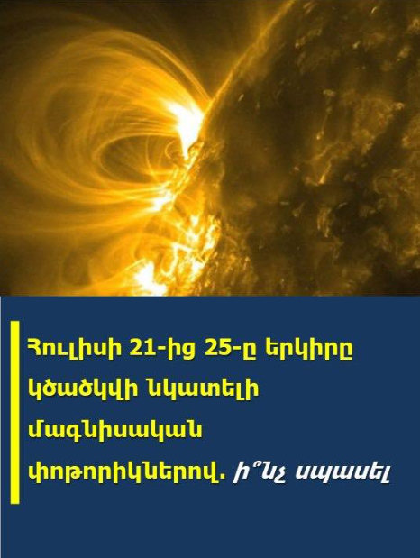 Մագնիսական փոթորիկների առաջին նշանները սպասվում են երկուշաբթի՝ հուլիսի 21-ին, ժամը 21:00-ից: Հաջորդ 24 ժամվա ընթացքում կդիտվի թույլ մագնիսական փոթորիկ (չորրորդ մակարդակ): Հուլիսի 22-ին, երեքշաբթի երեկոյան, գեոմագնիսական ակտիվությունը կհասնի հինգերորդ մակարդակի գագաթնակետին և կմնա այս մակարդակում հաջորդ քառասունութ ժամվա ընթացքում: