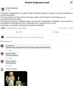 Նա իր գրառման մեջ, մասնավորապես, նշել է․ «Ես Արեանա Գրիգորյանն եմ՝ 24-ամյա Սերգեյ Հակոբյանի նշանածը։ Ուզում եմ, որ բոլորը դադարեն սուտ լուրերի տարածումը։