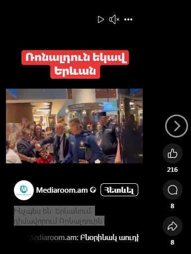 Ինչպես են Երևանում դիմшվորում Ռոնալդուին Published by: 04.09.2025Category: ՀայաստանAuthor: admin Ինչպես են Երևանում դիմավորում Ռոնալդուին Տեսանյութ