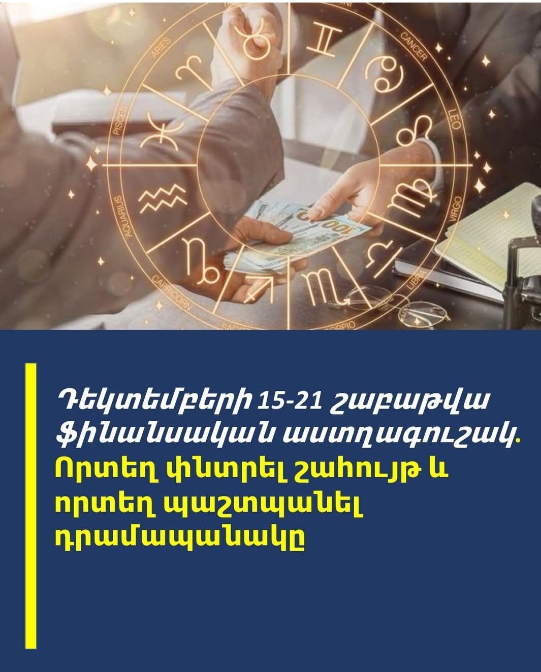 Գեղեցկություն և ներդաշնակություն գտնելու ձեր տաղանդը տարածվում է նաև ֆինանսների վրա։ Դուք կկարողանաք լավ գործարքներ կնքել նույնիսկ սովորաբար թանկարժեք իրերի վրա՝ սկսած ճանապարհորդական փաթեթներից մինչև դիզայներական իրեր։ Փնտրեք ակցիաներ, քեշբեք և հավատարմության ծրագրեր։ Աշխատանքը կլինի կայուն՝ առանց հանկարծակի տատանումների։ Սա իդեալական ժամանակ է ձեր բյուջեն կարգի բերելու, գալիք տարվա ձեր ֆինանսական նպատակները գեղեցիկ ուրվագծելու և զեղչված արձակուրդ պլանավորելու համար։Կարիճ (հոկտեմբերի 24 – նոյեմբերի 22)