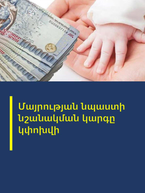 Մայրության նպшստի նշանшկման կարգը կփոխվի Published by: 05.02.2025Category: ՏնտեսությունAuthor: admin Մայրության նպաստի նշանակման կարգը կփոխվի