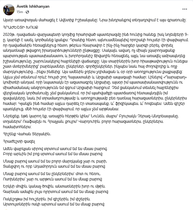 «Այսօր առավոտյան մահացել է Ավետիք Իշխանյանը։ Նրա խնդրանքով տեղադրվում է այս գրառումը։