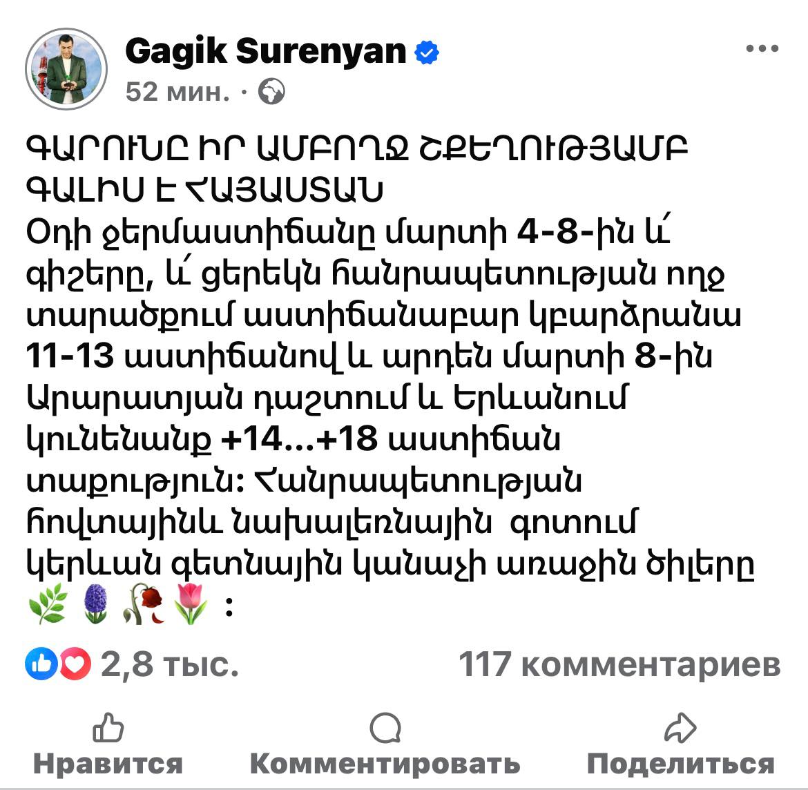 Գագիկ Սուրենյանը սոցիալական ցանցի իր էջում գրառում է կատարել․ < Օդի ջերմաստիճանը մարտի 4-8-ին և՛ գիշերը, և՛ ցերեկն հանրապետության ողջ տարածքում աստիճանաբար կբարձրանա 11-13 աստիճանով և արդեն մարտի 8-ին Արարատյան դաշտում և Երևանում կունենանք +14…+18 աստիճան տաքություն: Հանրապետության հովտայինև նախալեռնային գոտում կերևան գետնային կանաչի առաջին ծիլերը>: